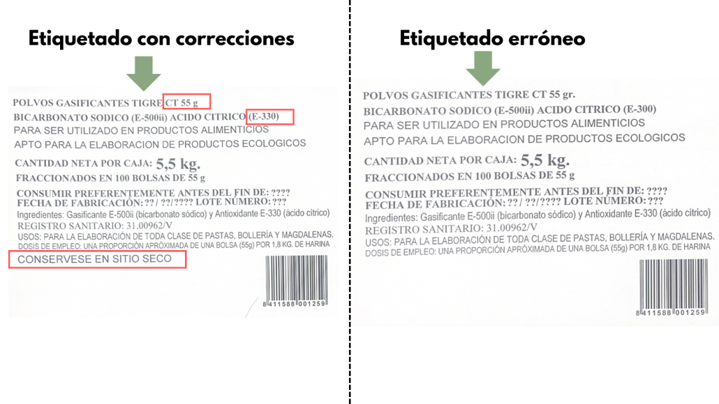 Estimados clientes, queremos informarles de un error detectado y subsanado, en el etiquetado del producto Polvos Gasificantes Tigre 55 gramos (Referencia 1011). En el etiquetado erróneo figura como titulo de producto POLVOS GASIFICANTES TIGRE CT 55 GR BICARBONATO SODICO (E-500II) ACIDO CITRICO (E-300). Sin embargo, aclaramos que el título correcto y ya subsanado es POLVOS GASIFICANTES TIGRE CT 55 G BICARBONATO SODICO (E-500II) ACIDO CITRICO (E-330). Además hemos añadido la recomendación de conservación: CONSERVESE EN LUGAR SECO. Lamentamos los inconvenientes que este error pueda haber causado y agradecemos su comprensión. Para cualquier duda, no duden en ponerse en contacto con nuestro servicio de atención al cliente. Añadimos las imágenes del etiquetado para que puedan ver las actualizaciones realizadas.